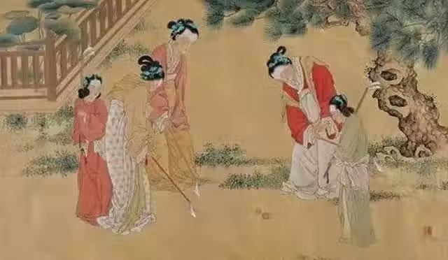 來自明代白描高手杜堇的畫作《仕女捶丸圖》,同樣描繪了姿態優雅、著裝光鮮、身份顯赫的仕女玩捶丸的優美景象。