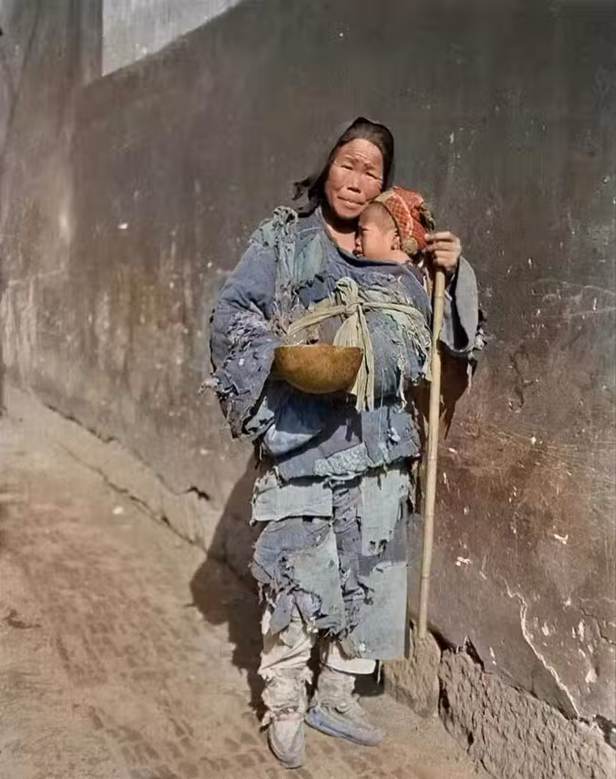 討飯的娘家,母親一手拿著瓢,一手拿著打狗棒,孩子在懷里餓得直哭,這就是清末底層百姓的真實生活。衣衫襤褸,饑不擇食,滿臉都是悲戚。