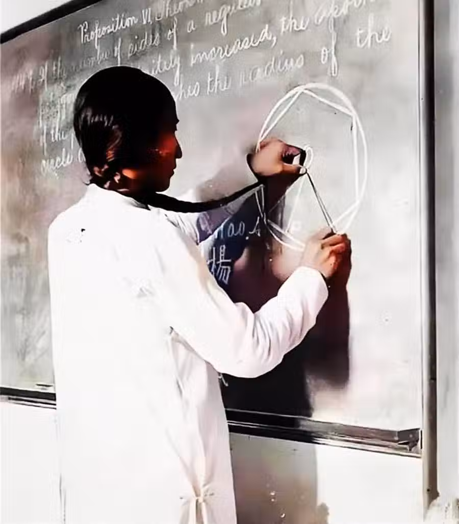 新式學堂上,國人身後的辮子有了新的用場,一位學生正在黑板前拿著辮子當圓規,畫完圓後又畫了一個六邊形。他畫非常熟練,也非常的標準,讓人嘆為觀止。黑板上的英文書寫也非常棒,比今天很多人寫的都要好!