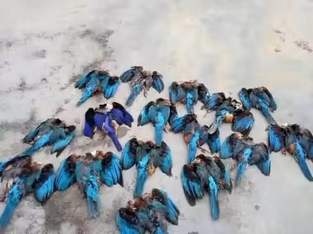 翠鳥賣家展示的翠鳥屍體,其中藍色翠鳥為藍翡翠(Halcyon pileata)。| Wikipedia