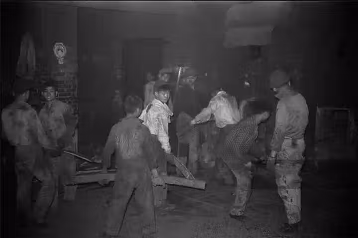 3、一處鐵工廠的童工在惡劣的條件下作業。由於家貧,不少孩子國小畢業後即被迫工作,失去教育的機會。