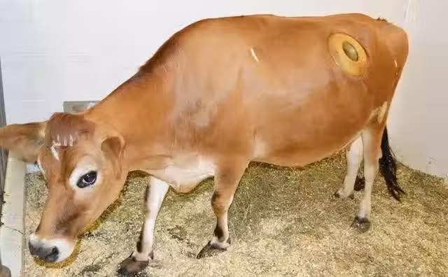 這種被插了管子的牛叫做「瘺管牛」,這個「窗戶」有一個蓋子,正常情況下是蓋著蓋子的,工作人員想要看看牛的身體內部的情況時就會打開蓋子,然後觀察或者取出部分樣品到實驗室化驗!