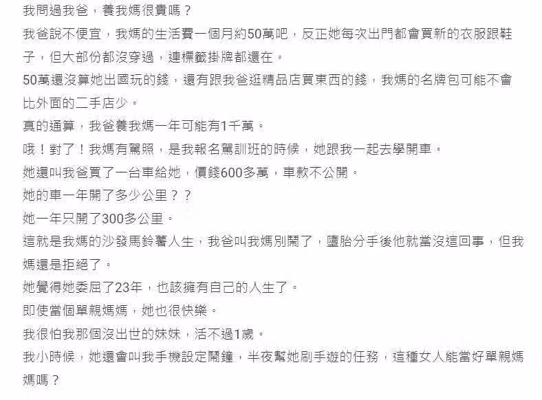 我媽媽45歲,是個少奶奶,沒工作過、不會做家事,凡事有傭人負責,名牌包和鞋子數不清,我爸每月還讓她收24萬房租,但她出軌了,還有了孩子...爸爸願意原諒,但她覺得委屈20多年,就算當個單親媽,也很快樂...身為女兒我該怎麼辦?