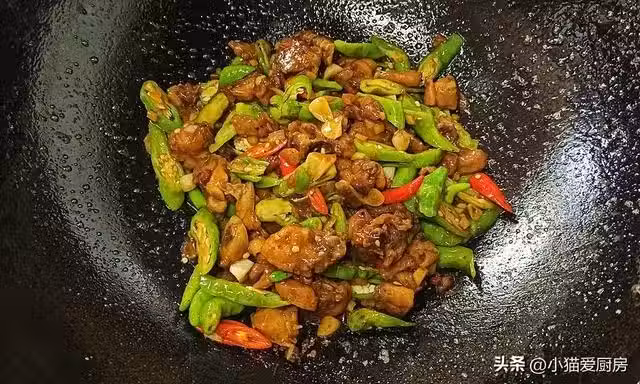 【步驟八】:辣椒炒斷生,放入花椒麵1勺、辣椒麵2勺、孜然面2勺、雞精1勺,繼續翻炒均勻出鍋裝盤成菜。