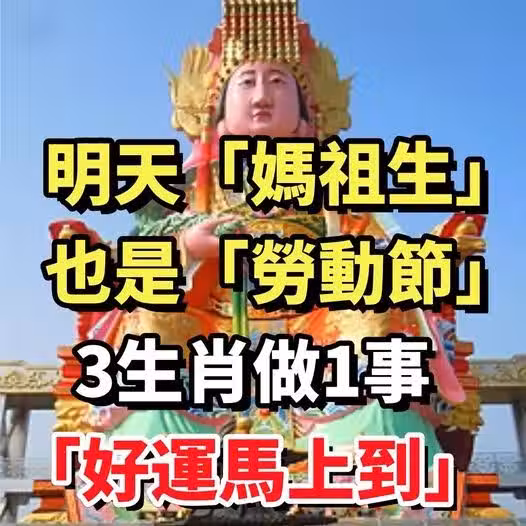 農曆3月23日是俗稱的「媽祖生」,當天適逢五一勞動節,「媽袓生,3生肖拜完媽祖後好運立刻到」,快去拜拜,讓讓自己好運翻倍。