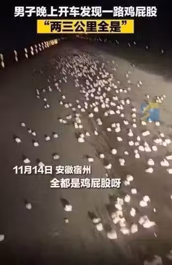 當晚與孔先生同行的魏先生猜測, 可能是運輸雞屁股的貨車車廂開了,散落了一路。「我們當地並不吃雞屁股,有可能是拉去做飼料的。」魏先生說。