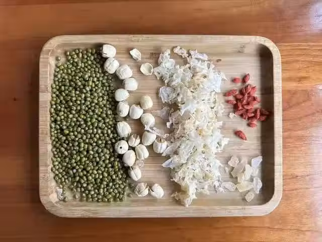 2、先把銀耳和蓮子清洗乾淨加在砂鍋里,加入足夠的清水,大火燒開轉小火燉20分鐘左右;再把冰糖和綠豆加進去,繼續燉15分鐘左右;