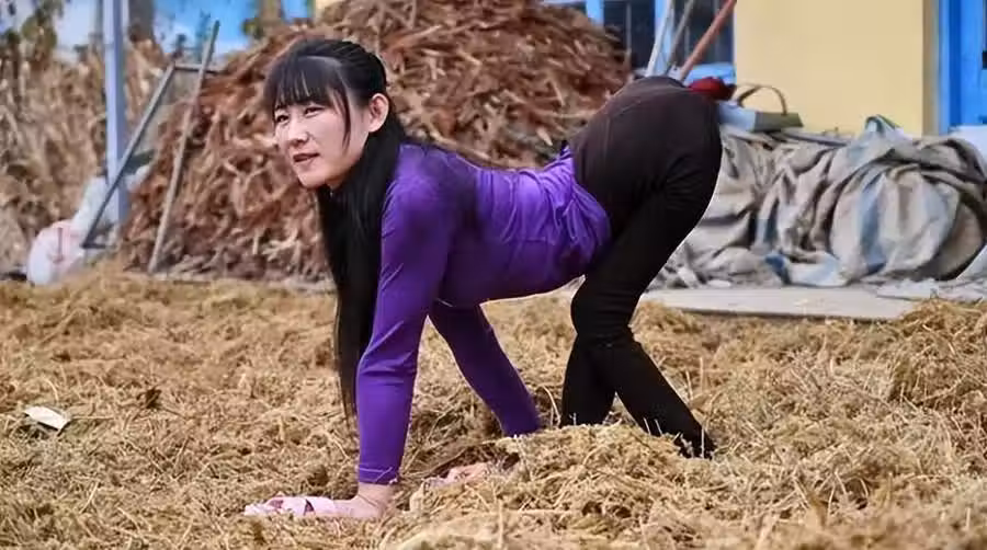 董明英身患殘障,她軀干塌陷、上半身只能「疊起來」,日常生活中也只能以一種難以言喻的姿勢,「四腳並用」地在地上爬行……