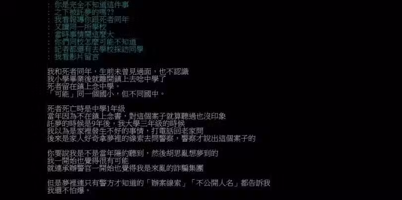 根據男大生的描述,崔曉菁離開得相當冤枉,也有拿到黑令旗,照理說應該可以沉冤昭雪,但是讓人摸不著頭緒的事,在夢中似乎已經沒有意願要破案,加上家人的態度、還有當時社會質疑,最後男大生也被下令不能再提起,案件至今沒有偵破。
