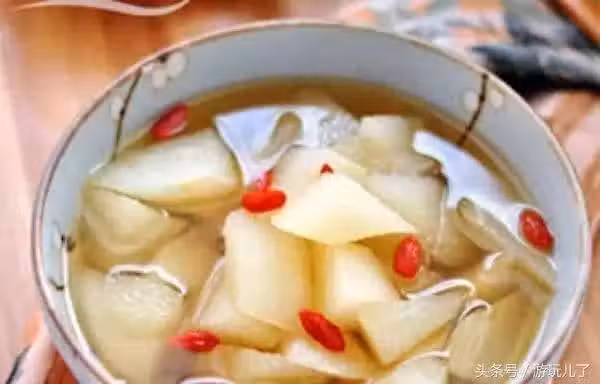 做法: 1.將雪梨洗凈去皮,切成小塊。 2.將3大碗水倒入煮鍋,煮沸後加入雪梨塊和枸杞。 3.用小火燜3-5分鐘後加入冰糖,待冰糖完全融化後即可食用。