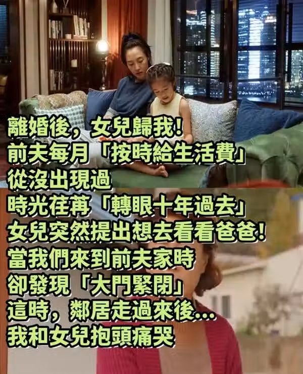 失婚後,女兒歸我! 前夫每月「按時給生活費」從沒出現過 時光荏苒「轉眼十年過去」女兒突然提出想去看看爸爸!當我們來到前夫家時,卻發現「大門緊閉」這時,鄰居走過來後...我和女兒抱頭痛哭