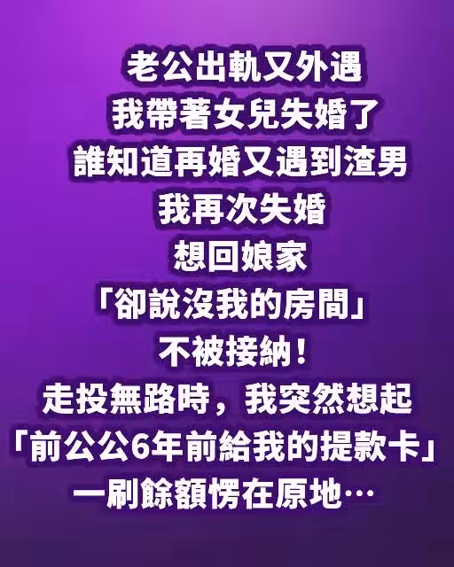 老公出軌又外遇,我帶著女兒失婚了 …誰知道再婚又遇到渣男我再次失婚,想回娘家「卻說沒我的房間」不被接納! 走投無路時,我突然想起「前公公6年前給我的提款卡」 一刷餘額愣在原地~