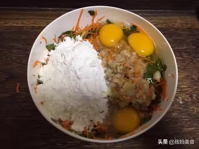 5、拌好的蔬菜里倒入扇貝肉,磕入雞蛋,加入麵粉、小蘇打,重點來了,小蘇打是鹼性物質,能中和胃酸溶解黏液,降低消化液的濃度,具有健胃、抑酸和增進食慾的作用,還能起到蓬鬆的作用。
