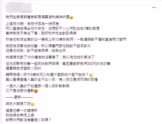 6歲兒尿急!13樓陽台尿尿「樓下鄰居被淋到」氣炸衝上來 媽哭訴「直接敲門好沒禮貌」:還敲詐我300塊