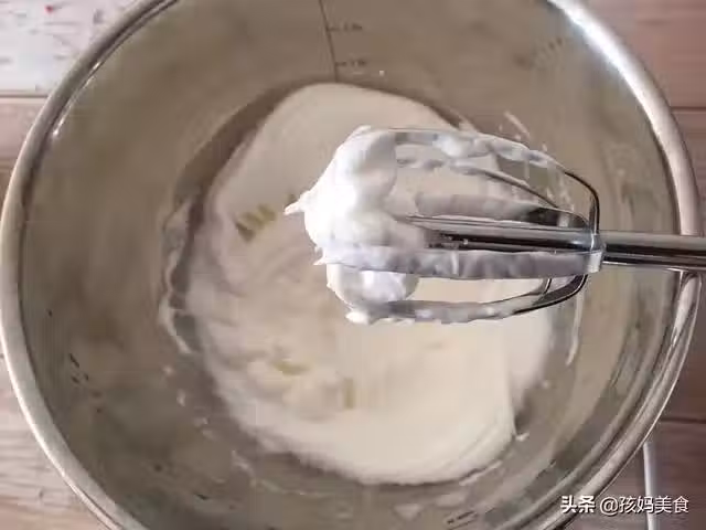 3、打發至硬性發泡出現挺立的小尖。烤箱160度預熱。