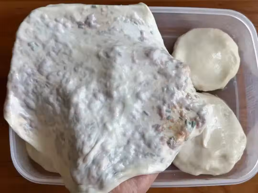 6、在平底鍋中噴上一些食用油,將抻好的面劑放入鍋中。蓋上鍋蓋,用中火烙制。大約1分鐘後,當面劑表面鼓起時,用鏟子輕輕翻面。繼續烙制至兩面微微焦黃即可出鍋。由於餅非常薄,所以熟得很快,不需要烙制過久以免變干影響口感。