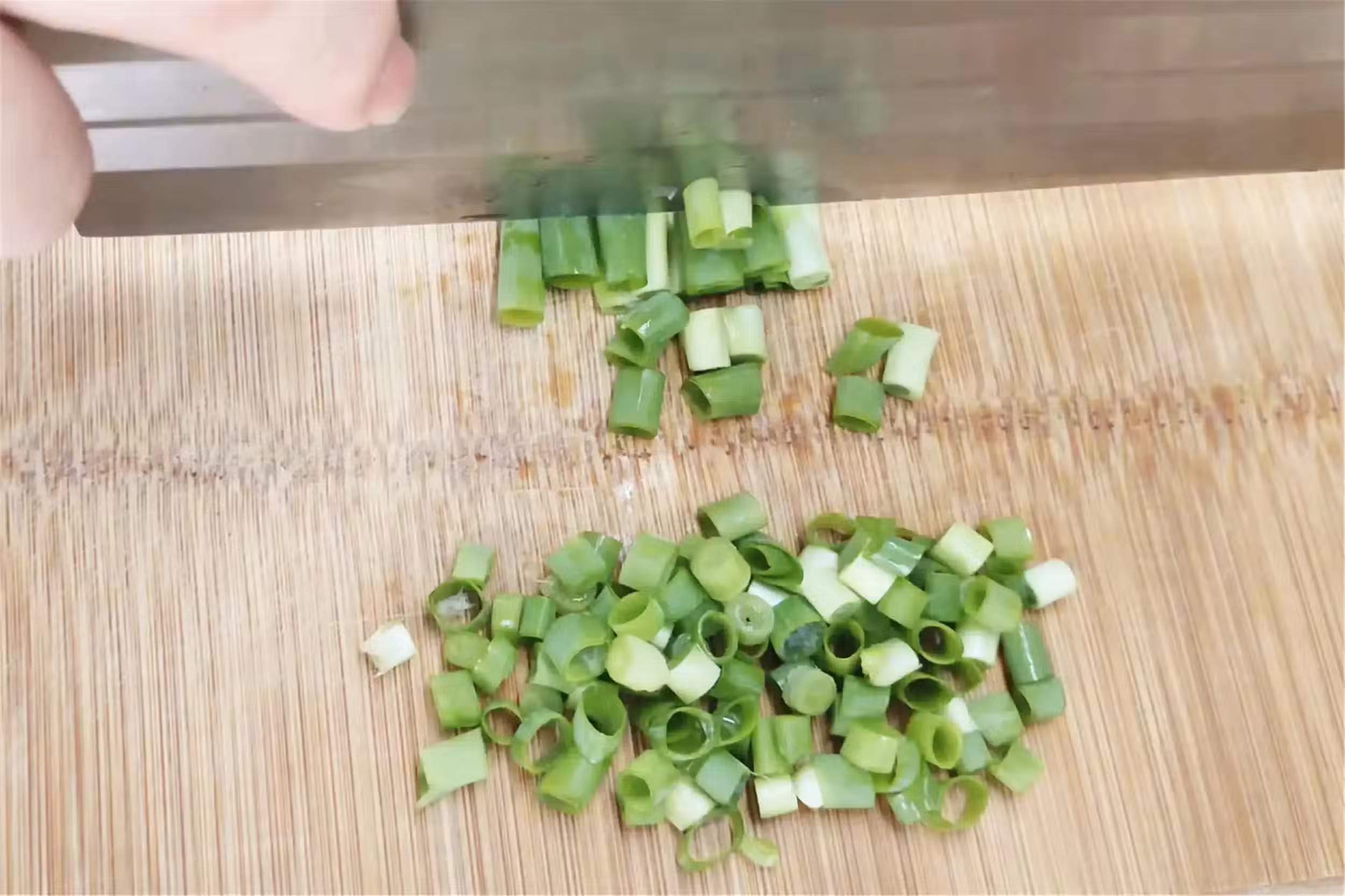 4、取3顆雞蛋打入碗中,加少量的鹽,把澱粉水倒入蛋液中攪拌均勻,最後倒入一把蔥花,再次攪拌。