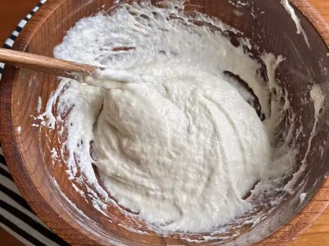 2、醒面完成後,我們可以開始調製麵糊了。將剩餘的清水分次加入麵糰中,邊加水邊攪拌,直至麵糊達到一種濃稠如酸奶的質地。這樣的麵糊在蒸製時會更容易定型,口感也會更加勁道。