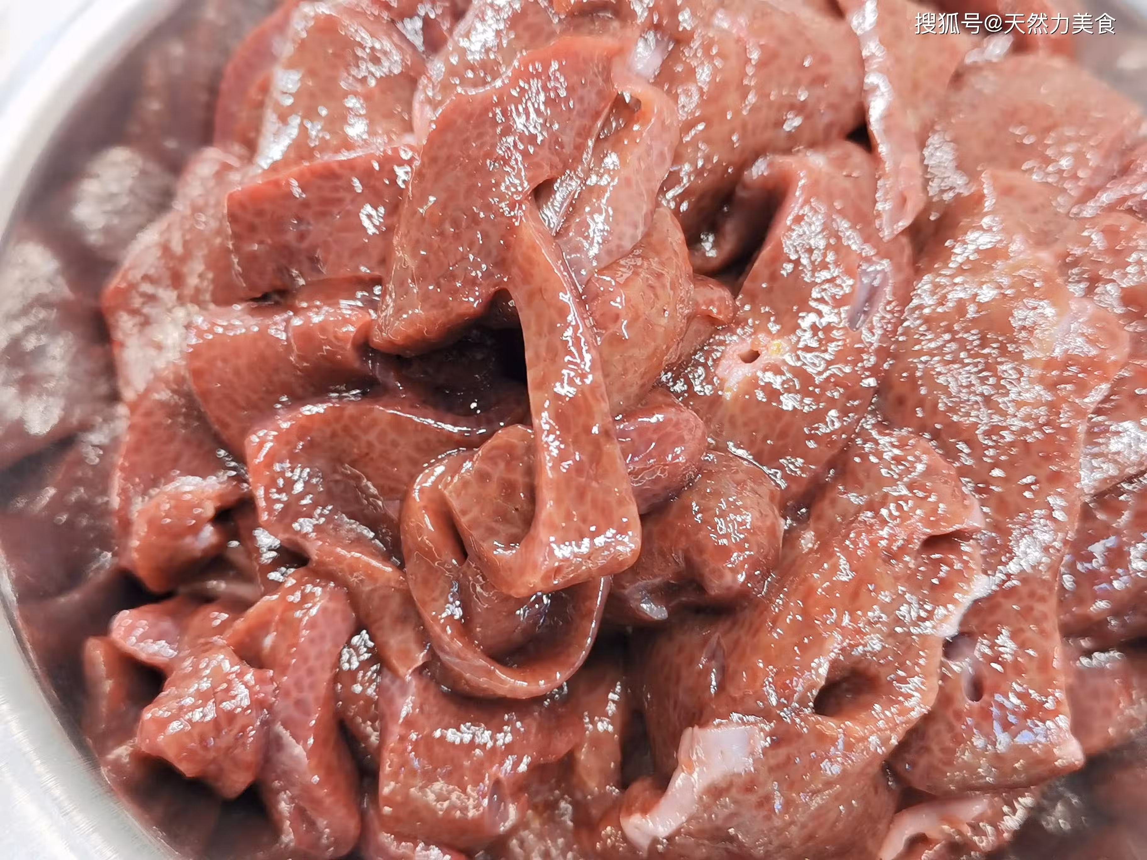 3、豬肝裡面的血水會比較多,而豬肝的主要腥味就來自裡面的血水,所以要想炒出來的豬肝不腥,那就要徹底把豬肝裡面的血水清洗出來。先用清水把切好的豬肝清洗兩遍,先把表面的一些血水洗出來,但是這樣是絕對不能徹底清洗乾淨的,只能對表層的血水和雜質做初步的處理。