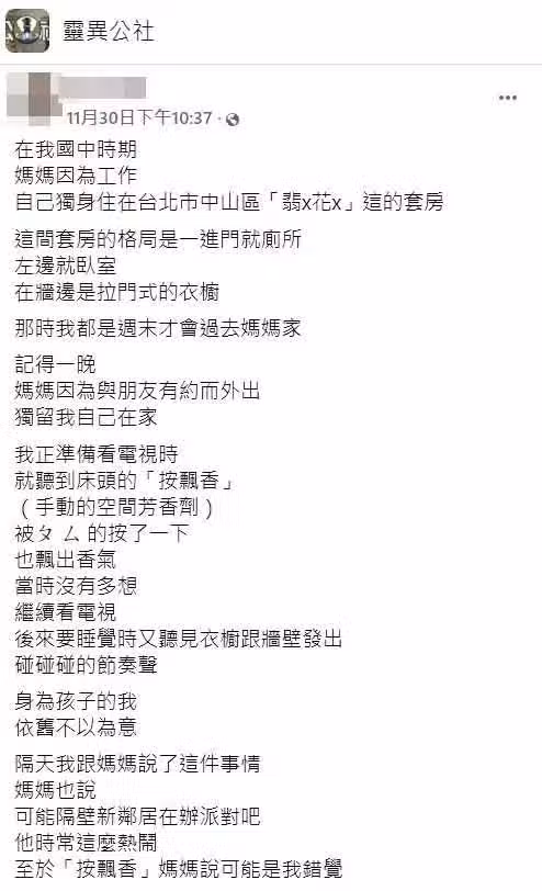 原來該名朋友在睡夢中,按了媽媽家的電鈴,卻看到一位皮膚白皙清秀的女子告知,「虧你們曾經是好朋友,你不知道她爸爸過世了喔!」,讓原PO打趣「看來這位隱形房客,都有在幫我媽媽看家!」圖/翻攝自「靈異公社」臉書