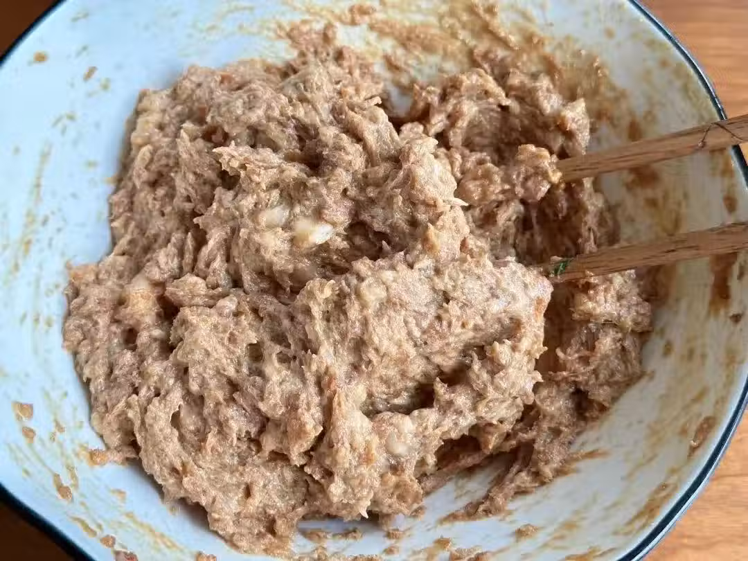 3、將之前切好的莧菜碎加入肉餡中,輕輕拌勻。莧菜的加入不僅為餃子增添了自然的清香,還使餡料的口感更加豐富。此外,我還加入了一些胡蘿蔔丁,既增添了色彩,又增加了營養。將所有材料充分攪拌均勻,直到餡料完全融合。