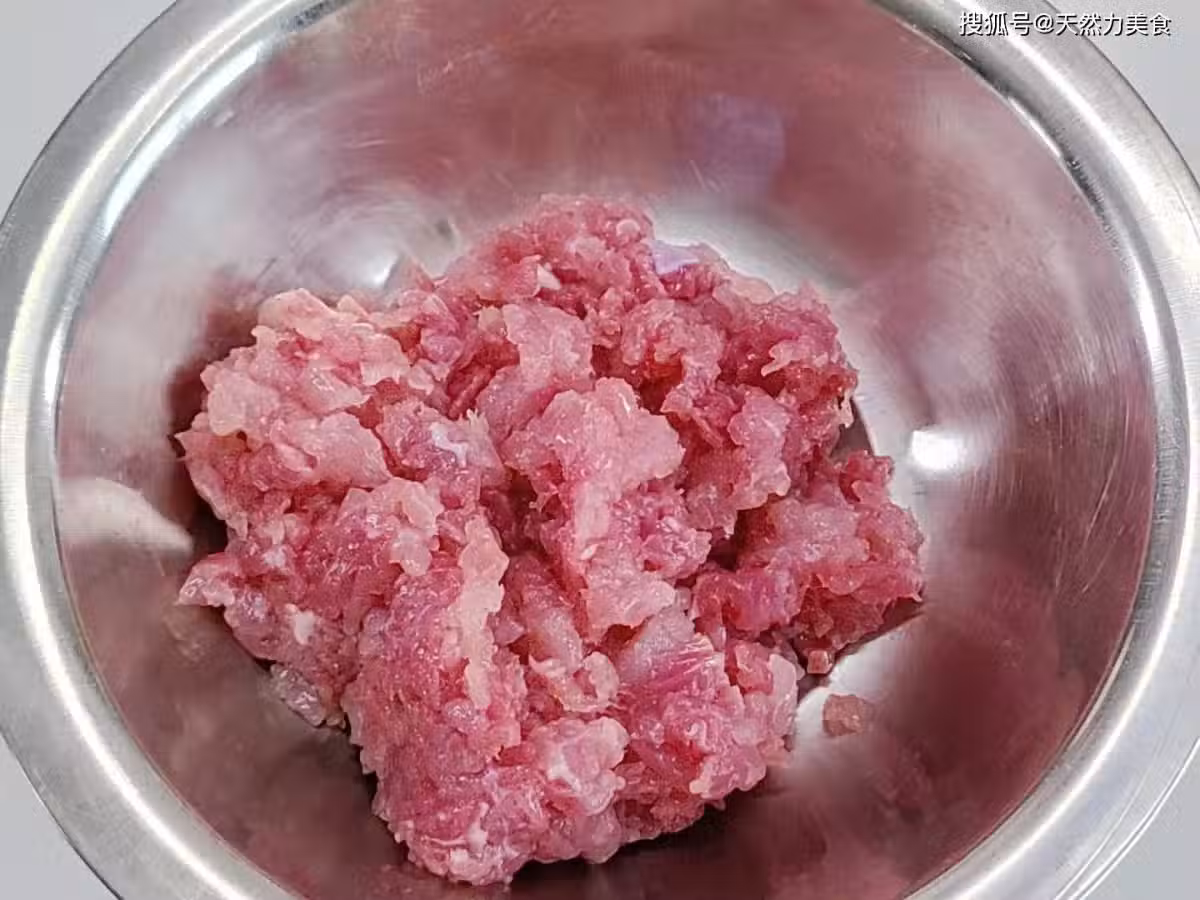 5、肉末剁好後就要腌制一下,加0.5克食鹽,0.5克雞精,還有3克芝麻香油攪拌均勻,讓所有的肉末都能均勻吸收調料的味道。攪拌均勻後還要加入5克紅薯澱粉,然後繼續充分攪拌均勻,讓肉末均勻地裹上薄薄的一層紅薯澱粉。