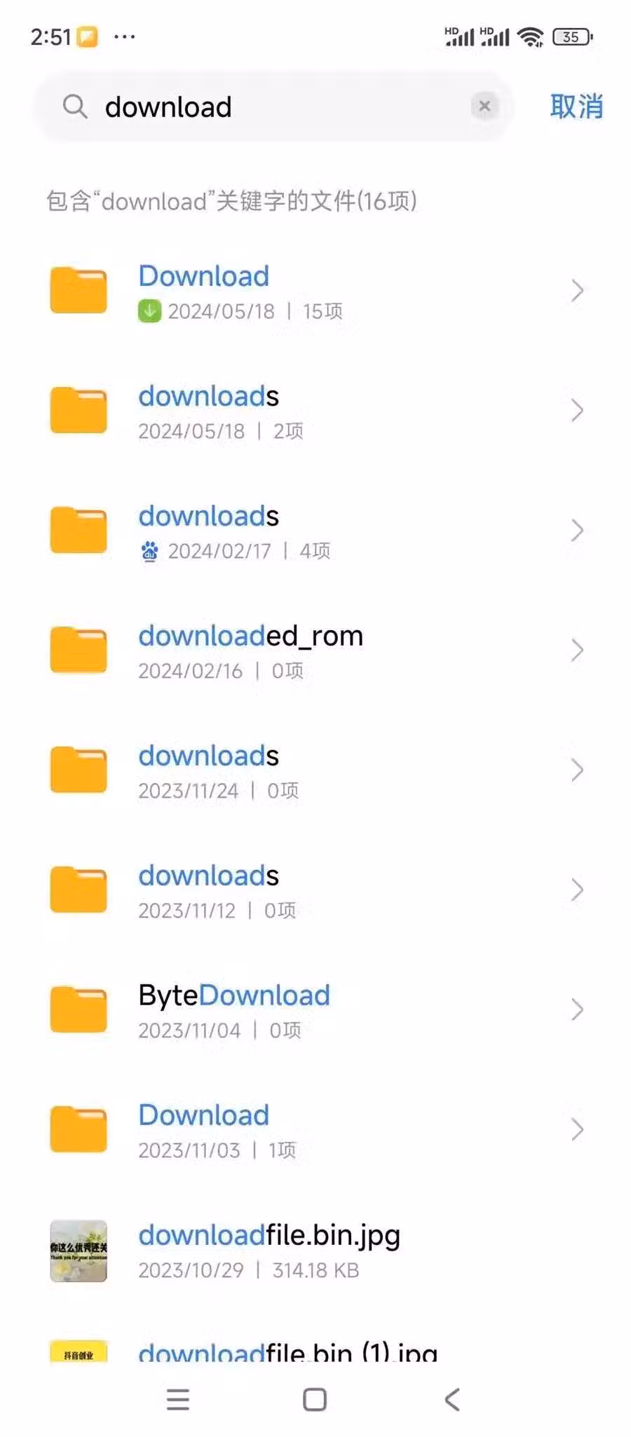 這個文件是手機里下載過一些資料的緩存垃圾文件,裡面有保存下載過的目錄,這個文件呢沒什麼大作用,留著他只是會占用我們的手機內存,我們在搜索框搜索這個文件,然後我們可以隨便任意找一個文件給大家演示舉例說明吧,