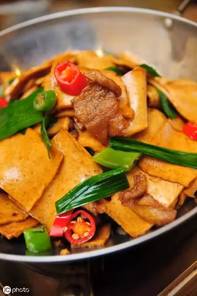 主料:千頁豆腐400克,青椒50克,花生仁50克。