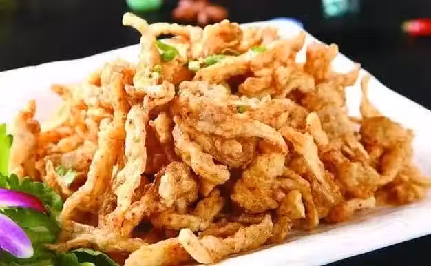 等蘑菇炸的酥黃時即可出鍋了.如果之前油溫沒掌握好,可以把油再燒熱復炸一下.撈出瀝油即可.