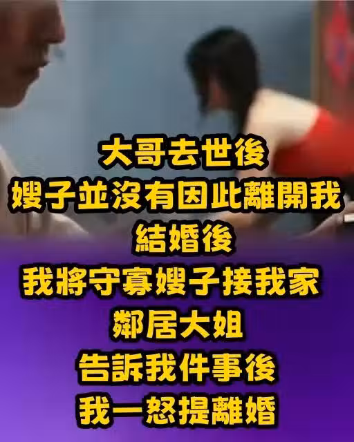 大哥去世後,嫂子並沒有因此離開我,結婚後我將守寡嫂子接我家,鄰居大姐告訴我件事後,我一怒提離婚