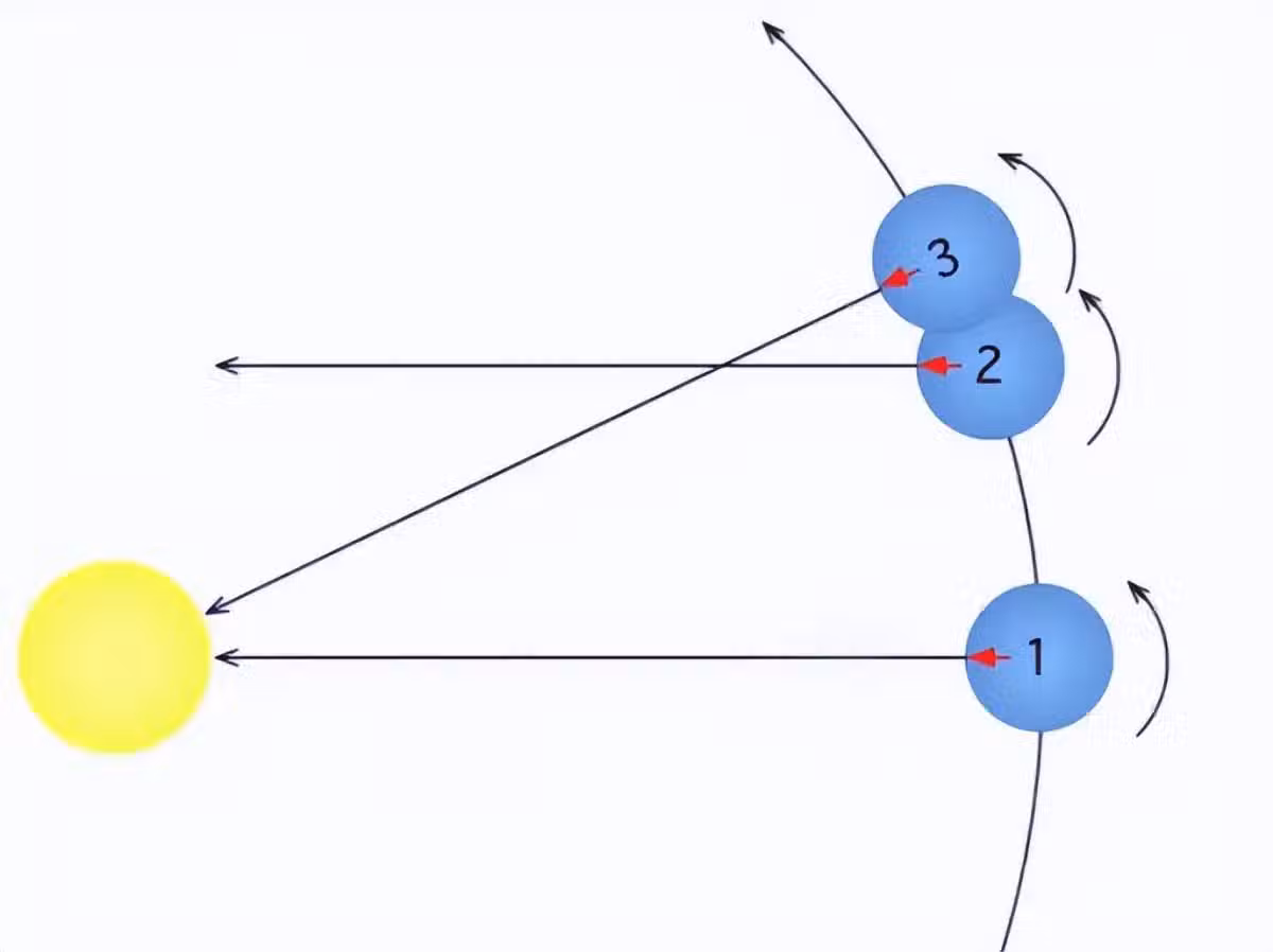 (如上圖所示,在位置1的時候,太陽正好位於觀測者的「最高點」,而當地球運行到位置2的時候,地球其實已經完成了一次自轉,但在觀測者看來,太陽此時還沒有到達「最高點」,只有當地球運行到位置3的時候,太陽才會位於觀測者的「最高點」)