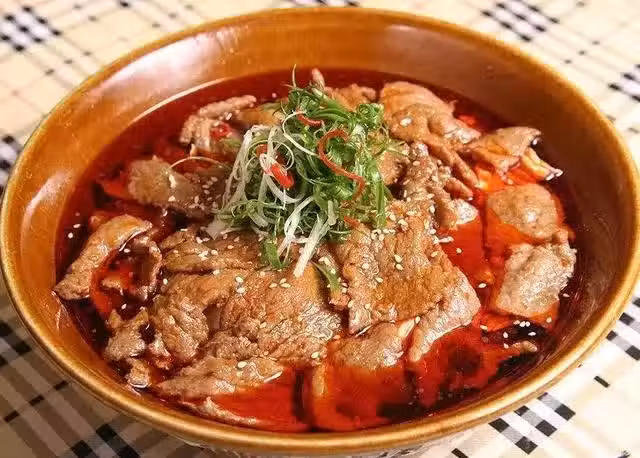 4、將干辣椒炸香製成椒油,倒入牛肉碗中即成。