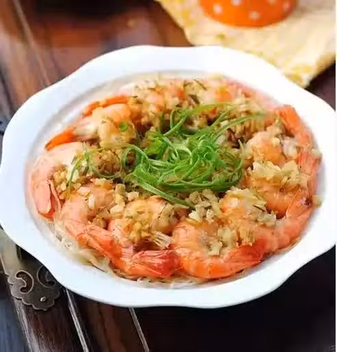 6、粉絲上鋪蝦,均勻的撒上醬汁,水開後蒸8-9分鐘取出裝飾即可。
