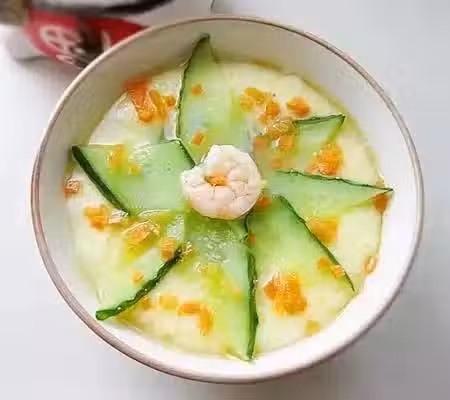 食材:雞蛋60g、芝麻油適量、鹽適量、黃瓜適量、蝦仁適量、水適量、胡蘿蔔適量