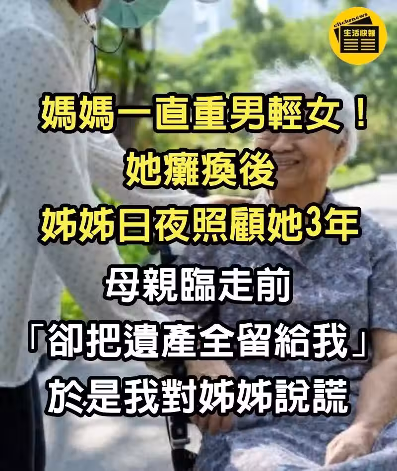 媽媽從小就重男輕女! 但她癱瘓後「卻是姐姐日夜照顧她3年」,母親臨走前「把遺產全留給我」於是我和弟弟決定對姐姐撒謊…