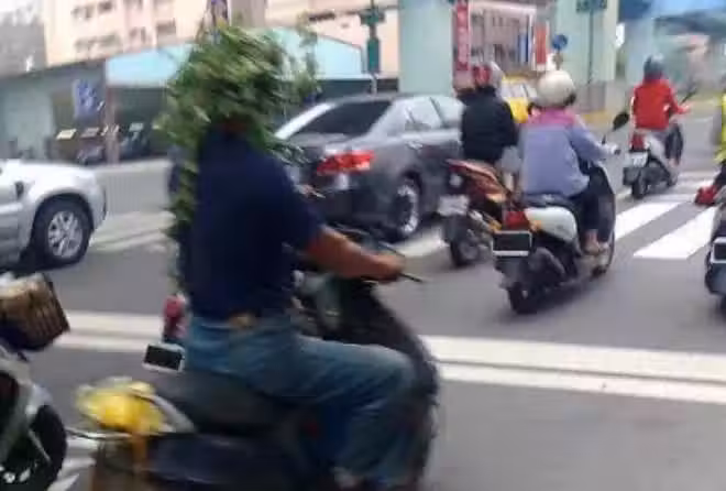 事實上,這樣的「奇葩」景象並不是第一次出現。早前也有網友分享過類似的搞笑場景。有一位男子忘記戴安全帽,為了逃過警察的檢查,竟然在路邊隨手抓起樹枝,圍在頭上,活像一隻綠油油的獅子,逗得大家捧腹大笑。