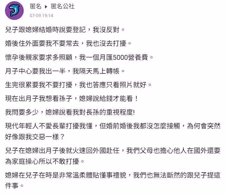 近日,媳婦已經做完月子回家,原PO滿懷期待、終於能看到孫子,結果媳婦說要給錢才能看,「我問要多少,媳婦說看我對長孫的重視程度!」媳婦在兒子面前一向溫柔體貼、懂事有禮貌,現在兒子人在國外工作,媳婦就露出真面目,「我們也無法斷然跟兒子提這件事,擔心他還要為家庭操心,所以不敢打擾。」
