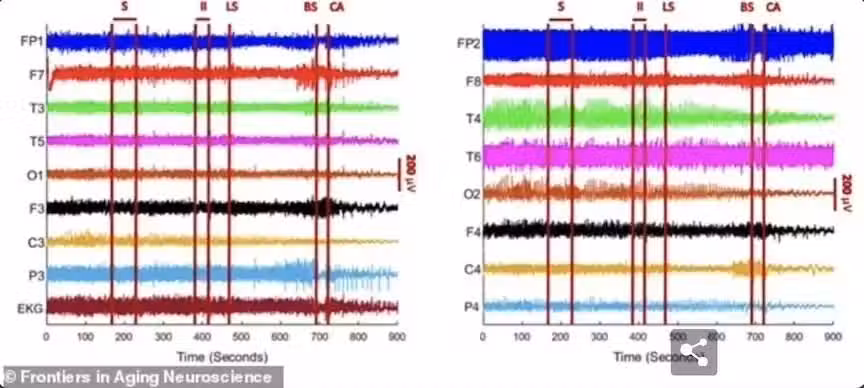 在病人死亡前後那段區域,他的大腦發生了一系列和神經有關的腦波振蕩,其中有明顯的gamma波振蕩,也同時伴隨著delta波,alpha波,beta波振蕩。