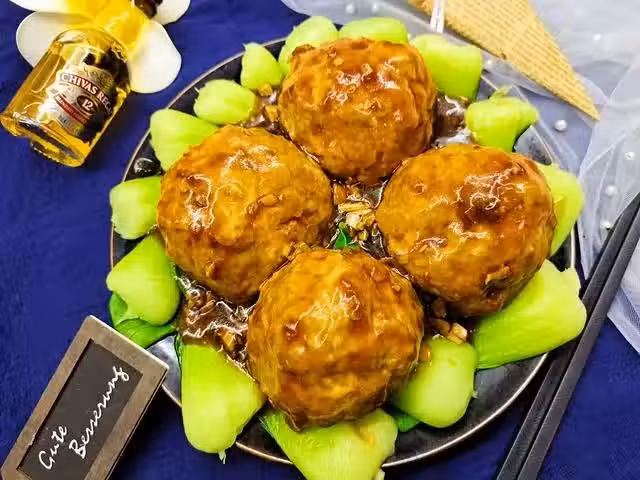 6、把蒸熟的丸子放入湯汁中燉一會兒,輕輕翻動讓丸子吸收湯汁的味道。
