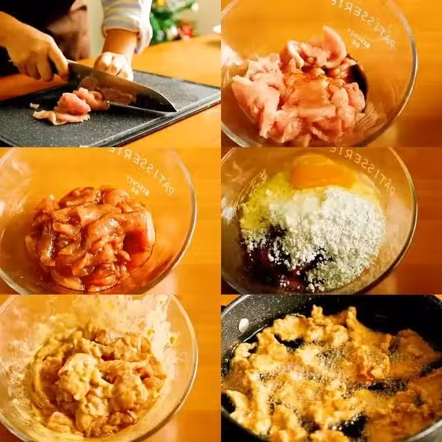 3、油燒至七成油溫,把肉片依次放入油鍋中,中火炸到肉片全部浮起來,表面變成金黃色,就可以撈出來了,要想更酥脆,可以再復炸一遍。