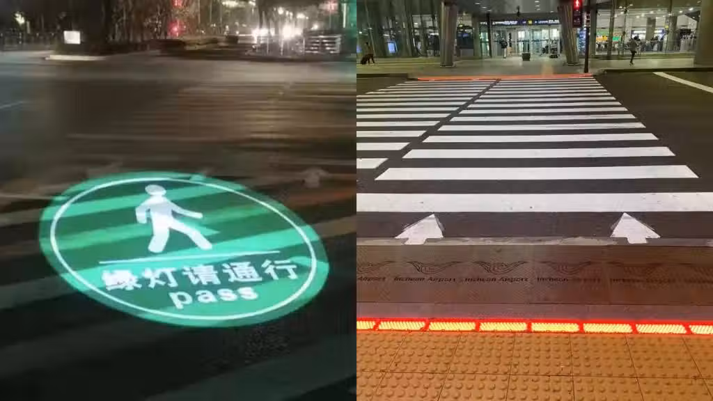 中國、韓國都有使用地板型紅綠燈,以投影或是LED光源呈現。(圖片來源 / 翻攝自微博、臉書)