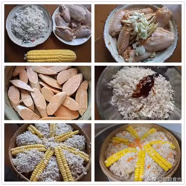 6、提前把玉米切成兩條一組,然後擺入蒸屜,玉米和糯米雞翅交替著擺,直到把蒸屜鋪滿,把剩下的糯米填到雞翅旁邊的縫隙中。
