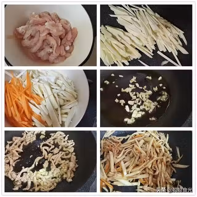 3、鍋里倒油燒熱,放入蔥花和蒜末爆香,然後放入腌制好的肉絲,炒至顏色變白。