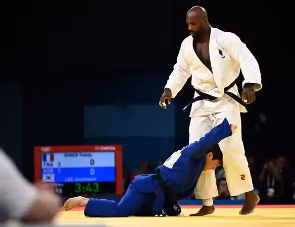 巴黎奧運柔道混合團體項目3日進行8強賽事,法國隊最終以4比1打敗韓國隊順利晉級,然而有一局賽事的照片賽後意外變成討論焦點,原來是該局的雙方選手體重相差60公斤、身高相差30公分,離譜的差距讓比賽局勢幾乎一面倒,甚至出現單手拉起對手的誇張情況。
