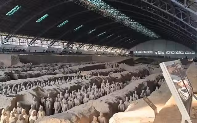 相較於一號坑的壯觀,二號坑則展現了秦軍更為複雜的兵種構成。這裡不僅有騎兵俑,他們騎著戰馬,身披鎧甲,手執長矛,眼神銳利,仿佛能穿透敵人的防線;還有車兵俑,他們站在戰車上,手握韁繩,神情專注,準備駕馭戰車衝破敵陣;更有弩兵俑,他們半蹲在地上,手持強弩,瞄準遠方,隨時準備發射致命一擊。