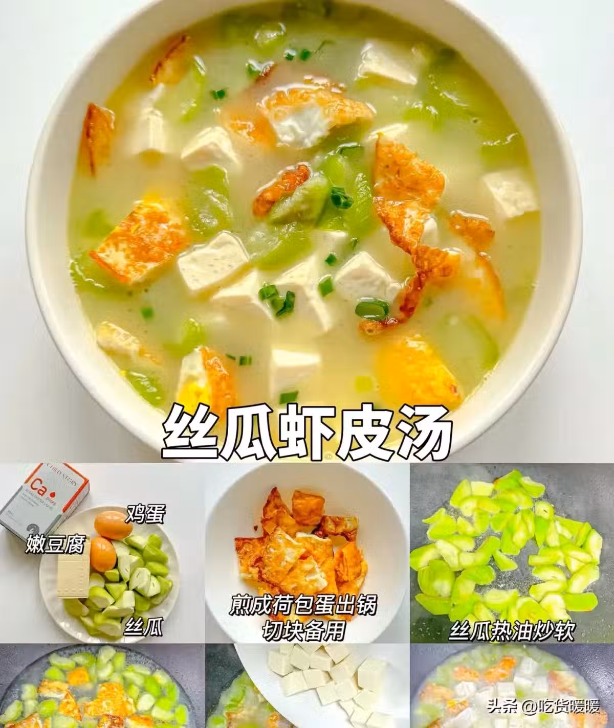 絲瓜 切塊備用 絲瓜熱油炒軟 加適量清水放入煎好的荷包蛋水開後倒入豆腐塊加鹽出鍋煮至湯白濃。