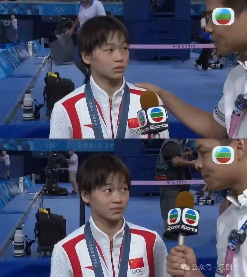 全紅嬋眼神望向鏡頭方向,估計有人叫她伸直受訪,她站直後就接不上回應,此時何沖輕拍全紅嬋的肩膀,以示鼓勵。