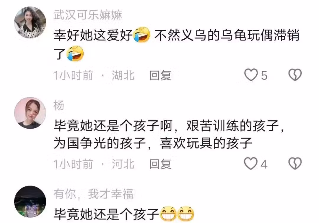有網友表示幸好他有這個愛好,不然在義烏的烏龜玩偶就滯銷了,還有網友表示畢竟他還是個孩子,是一個艱苦訓練為國爭光的孩子,喜歡烏龜玩具的孩子!