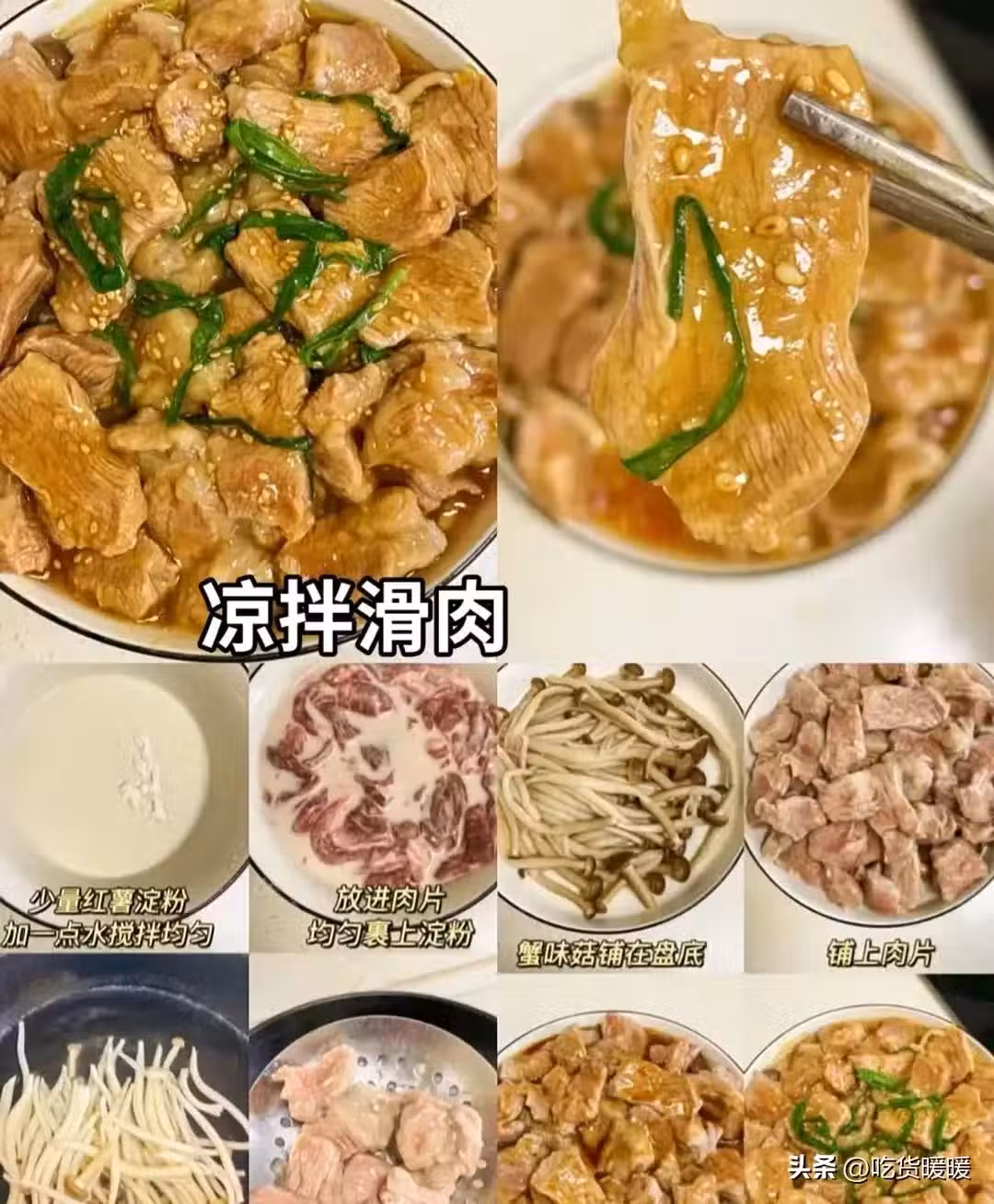 加一點水攪拌均勻 均勻裹上澱粉 蟹味菇鋪在盤底 鋪上肉片 淋上醬汁 蟹味菇焯水一分鐘 放入肉片煮熟撈出 澆上熱油即可。