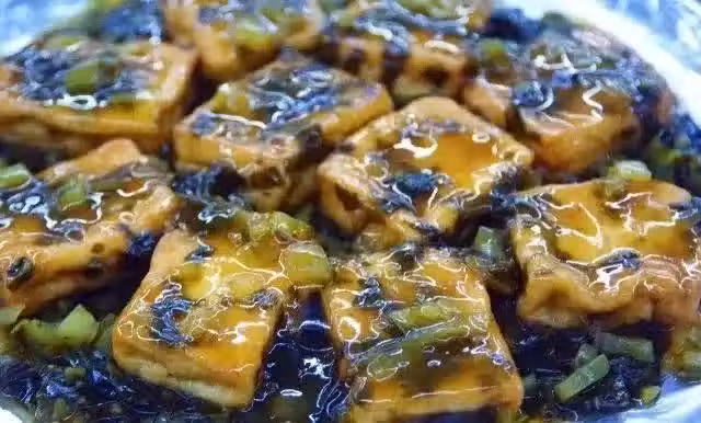 2、平底鍋加入食用油燒熱,放入豆腐,煎至兩面金黃時盛出。